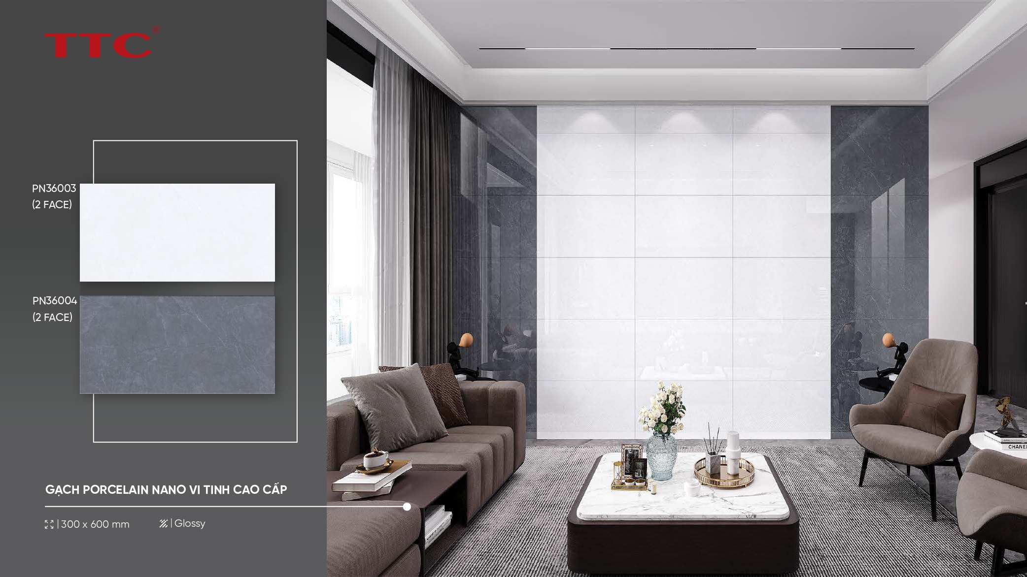 Dòng gạch granite nano vi tinh cao cấp, bề mặt bóng sáng, phù hợp không gian hiện đại.